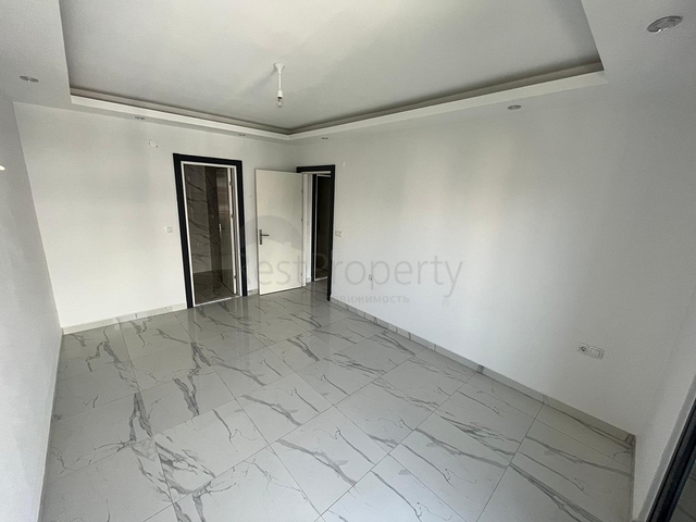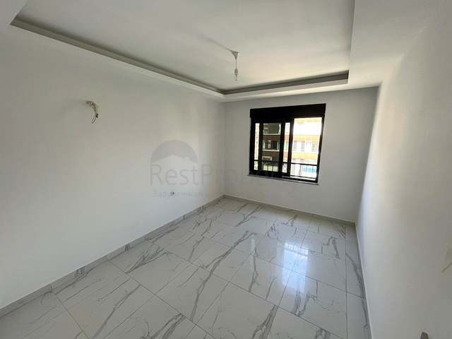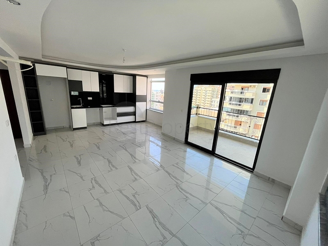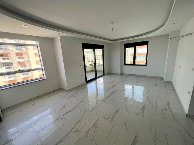 Сама квартира новая, в чистовой отделке со встроенным кухонным гарнитуром и полностью обустроенной ванной комнатой. Планировка 2+1 включает в себя две спальных комнаты, гостиную, совмещённую с кухней, две ванных комнату и два балкона. Из одного из балконов открывается вид на Средиземное море.. Площадь квартиры составляет 95 м2 и расположена она на 7 этаже девятиэтажного здания.