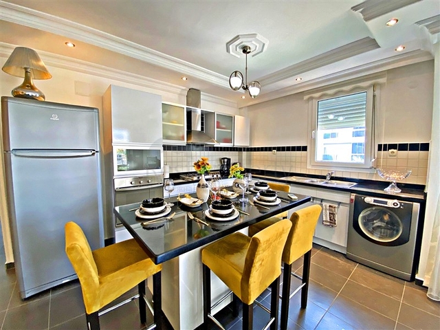 Квартира 2+1 расположена на 2 этаже и имеет площадь 120 м2. В квартире выполнен качественный ремонт, продается вместе с мебелью и техникой. Планировка 2+1 подразумевает наличие просторного салона, совмещенного с кухней и двух спальных зон. Всего в квартире два санузла, две душевые комнаты и два балкона.