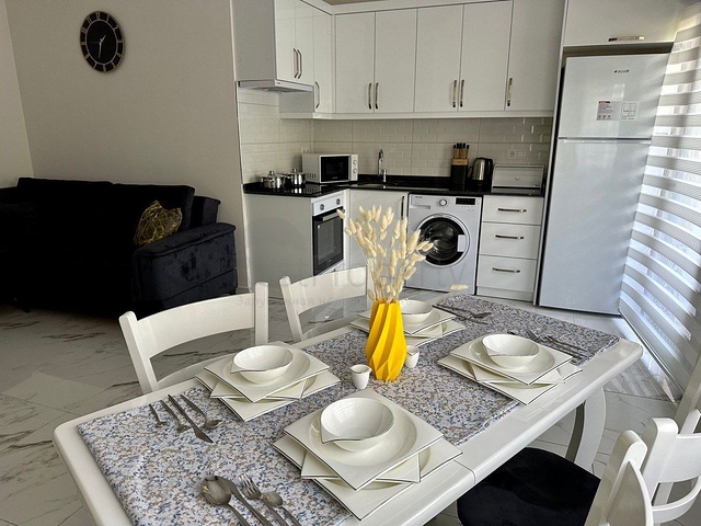 Продаётся светлая квартира планировки 1+1, расположенная на третьем этаже современного пятиэтажного дома. Общая площадь — 45 м². Внутри — гостиная, совмещённая с кухней из гранита, отдельная спальня, ванная комната с душевой кабиной и балкон. Квартира полностью меблирована и оснащена бытовой техникой, установлен кондиционер, полы выполнены из плитки.