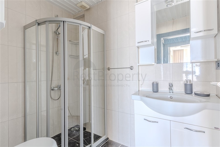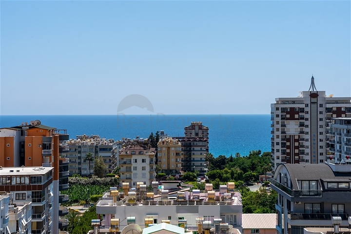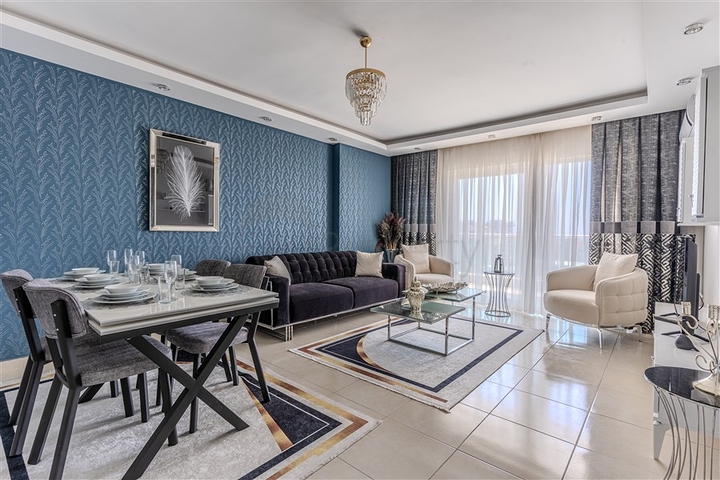 Трёхкомнатная квартира 2+1 расположена на девятом этаже жилого дома в районе Махмутлар. Общая площадь — 110 м². Планировка включает гостиную с кухонной зоной, две отдельные спальни, два санузла и два балкона. Квартира полностью меблирована и укомплектована бытовой техникой. В кухне использованы гранитные поверхности, напольное покрытие выполнено из керамической плитки, в ванных комнатах установлены душевые кабины. Для поддержания комфортного климата предусмотрены кондиционеры.