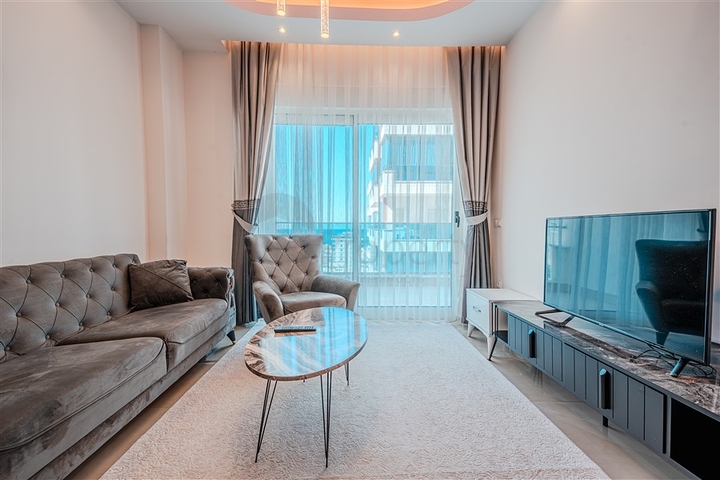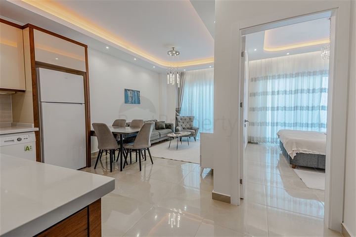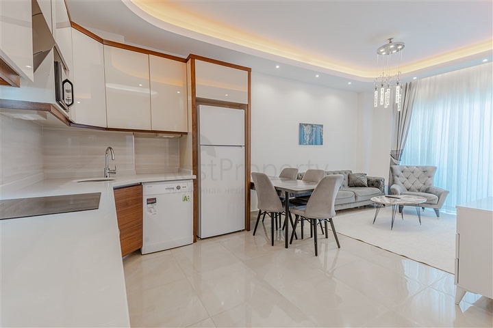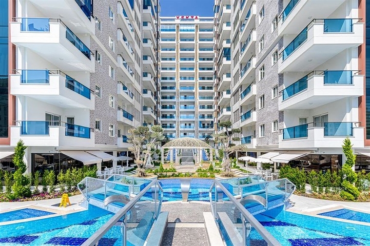 Двухкомнатная квартира 1+1 расположена на девятом этаже современного жилого дома в районе Махмутлар. Общая площадь составляет 55 м². Планировка включает гостиную с кухонной зоной, отдельную спальню, санузел и балкон. Квартира полностью меблирована и укомплектована бытовой техникой. В кухне установлены гранитные рабочие поверхности, напольное покрытие выполнено из плитки, в ванной комнате оборудована душевая кабина. Для комфортного проживания предусмотрена система кондиционирования и подогрев полов.
