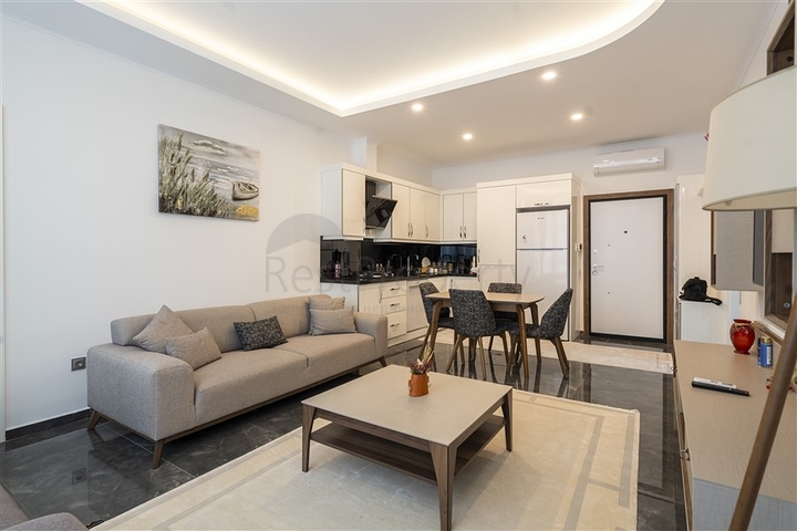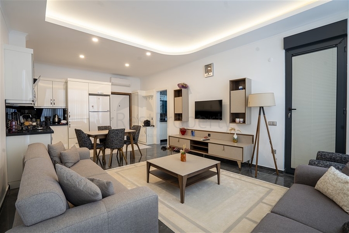 На продажу представлена аккуратная и функциональная квартира планировки 1+1, расположенная на втором этаже современного жилого дома. Общая площадь составляет 60 м². Планировка продумана для комфортного проживания и включает гостиную с кухонной зоной, отдельную спальню, ванную комнату и балкон. Квартира полностью меблирована и укомплектована бытовой техникой. В отделке использованы практичные материалы: напольное покрытие из плитки, кухонные столешницы из гранита, в ванной комнате установлена душевая кабина, предусмотрена система кондиционирования.