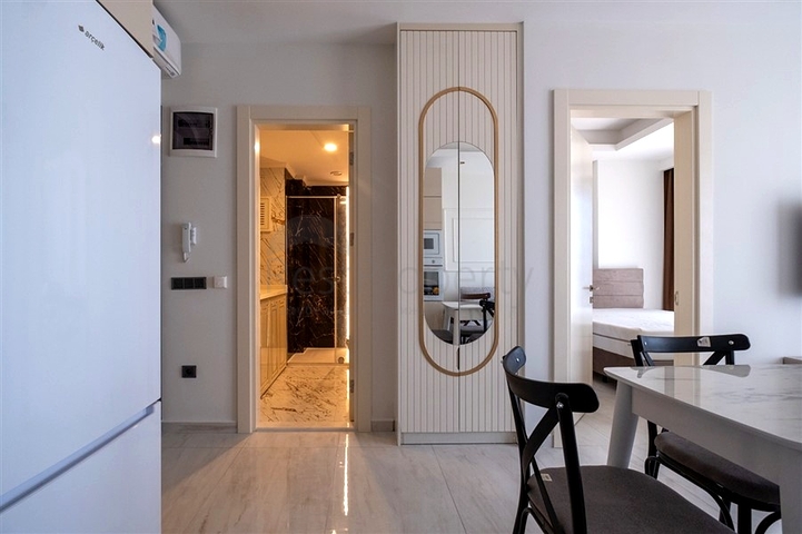 Предлагается светлая квартира планировки 1+1, расположенная на первом этаже современного жилого комплекса. Планировка продумана для комфортного повседневного проживания: гостиная с кухней открытого типа, отдельная спальня, ванная комната и балкон. Квартира полностью меблирована и оснащена бытовой техникой, установлены кондиционеры, использованы качественные отделочные материалы, гранитная рабочая поверхность на кухне, напольное покрытие из плитки, современная сантехника.