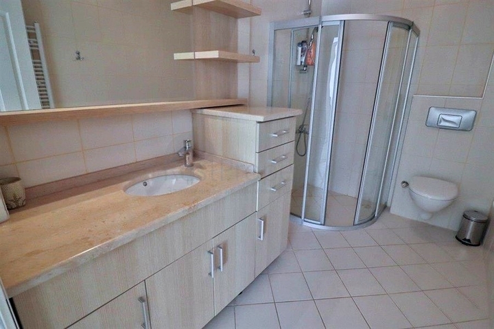 Квартира полностью меблирована и укомплектована бытовой техникой. Кухонная зона оборудована рабочей поверхностью из мрамора, напольное покрытие — керамическая плитка, в ванных комнатах установлены душевые кабины. В каждой комнате предусмотрлено кондиционирование, что обеспечивает комфортный микроклимат в любое время года.