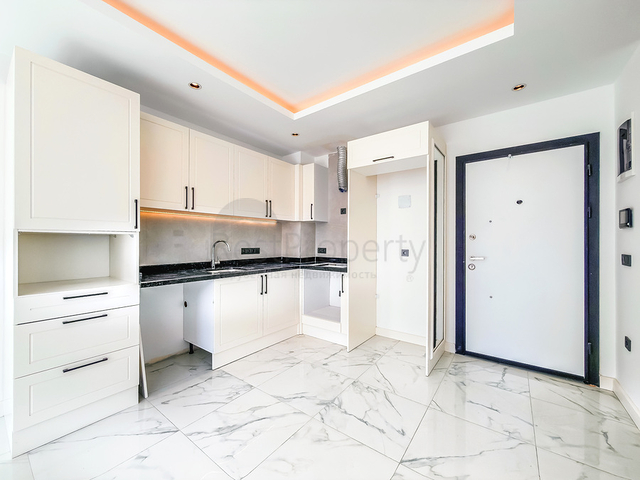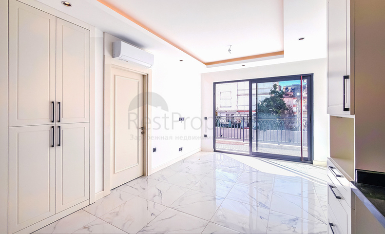 В квартире предусмотрена светлая гостиная с кухонной зоной, оборудованной гранитной рабочей поверхностью, отдельная спальня, ванная комната с душевой кабиной и балкон. Напольное покрытие выполнено из практичной плитки, установлены кондиционеры, интерьер оформлен в спокойных нейтральных тонах, обеспечивающих ощущение уюта и современного стиля.