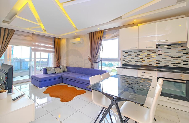 Предлагается светлая и аккуратная квартира планировки 1+1, расположенная на 4 этаже жилого дома 2017 года постройки. Общая площадь составляет 70 м². Планировка включает гостиную с кухней открытого типа, отдельную спальню, ванную комнату с душевой кабиной и балкон. Квартира полностью меблирована и укомплектована бытовой техникой, установлены кондиционеры, на кухне использована гранитная рабочая поверхность, напольное покрытие выполнено из плитки.