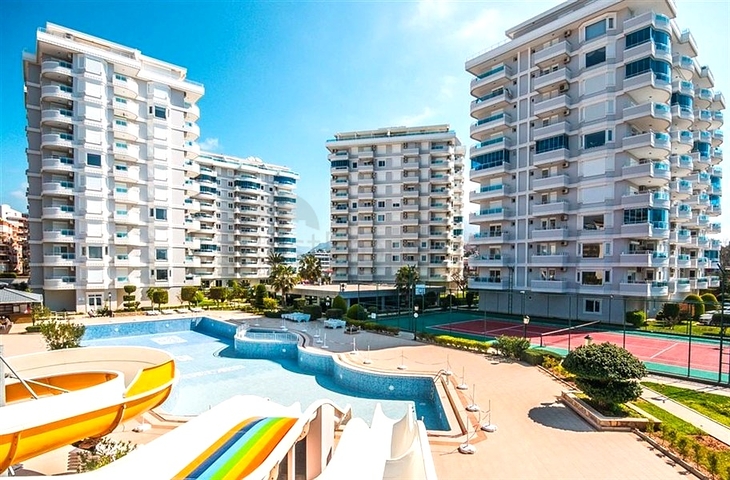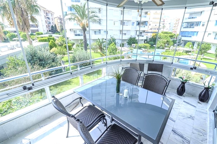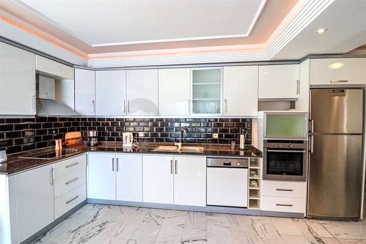 Предлагается меблированная квартира формата 3+1, расположенная на первом этаже, с продуманной планировкой и общей площадью 106 м². В квартире две ванные комнаты, два санузла и два балкона, что делает проживание комфортным для семьи. Интерьер выполнен в светлых тонах, кухня оснащена встроенной бытовой техникой, напольное покрытие — практичная керамическая плитка, установлены системы кондиционирования воздуха.