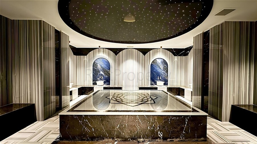 На территории и в здании предусмотрены: открытый бассейн, крытый бассейн, детский бассейн, сауна, хамам, парная, массажная комната, фитнес-зал, детская игровая площадка, игровая комната, кинотеатр, боулинг, бильярд, настольный теннис, зеленая территория, прогулочные дорожки, зона барбекю, интернет, телевидение, кафе, бар у бассейна, конференц-зал, маркет, генератор, открытая парковка, видеонаблюдение.