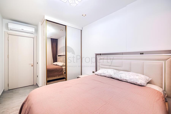Уютная квартира площадью 84 м² расположена на 2 этаже современного жилого здания. Планировка 2+1 включает светлую гостиную с кухней, две спальни, два санузла и балкон. Интерьер выполнен в спокойных тонах, квартира полностью укомплектована мебелью и бытовой техникой, установлено напольное отопление и система кондиционирования, что обеспечивает комфорт в любое время года.
