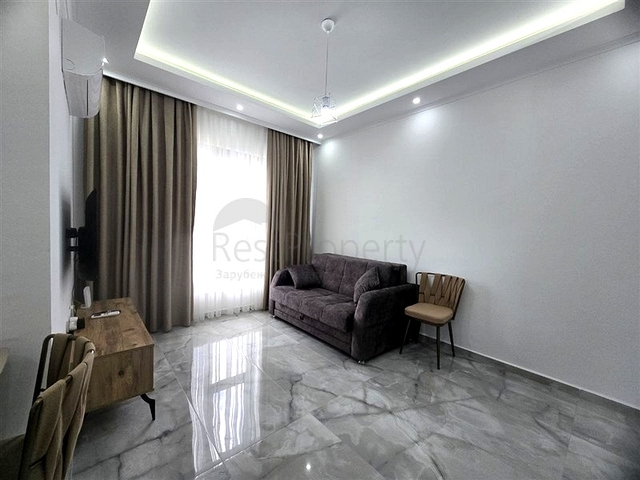 Планировка включает светлую гостиную с кухней открытого типа, отдельную спальню, ванную комнату с душевой кабиной и балкон. В отделке использованы качественные материалы: кухонная зона с гранитной столешницей, напольное покрытие — керамическая плитка, санузел оборудован современной сантехникой. Установлены кондиционеры для комфортного проживания в любое время года.