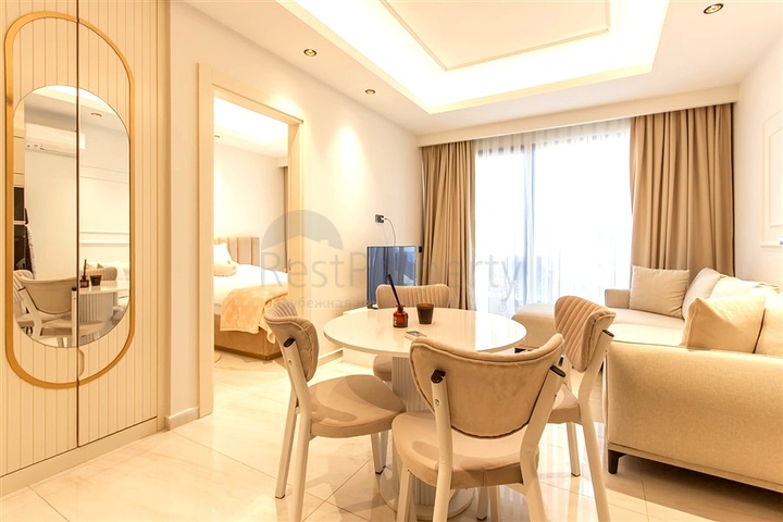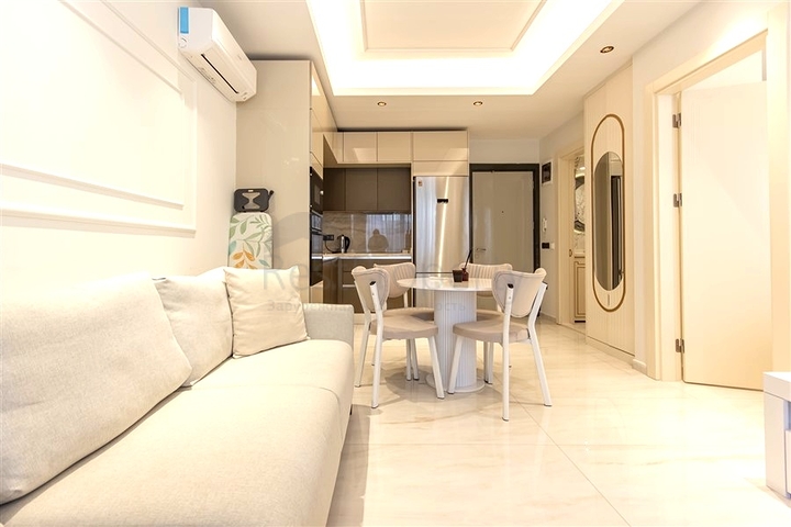 Предлагается стильная квартира формата 1+1, расположенная на 8 этаже современного жилого комплекса. Общая площадь 55 м² грамотно распределена: светлая гостиная с кухней открытого типа, отдельная спальня, ванная комната с душевой кабиной и балкон. Интерьер выполнен в светлых тонах, установлена встроенная кухня с гранитной столешницей, напольное покрытие — керамическая плитка, установлены кондиционеры. Квартира полностью оборудована мебелью и бытовой техникой.