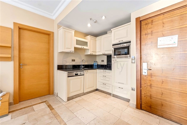 Квартира полностью меблирована и оснащена бытовой техникой, установлены кондиционеры, кухонная рабочая зона выполнена из гранита, напольное покрытие — плитка, в ванных комнатах установлены душевые кабины. Интерьер выполнен в светлых тонах, создающих ощущение уюта и комфорта.