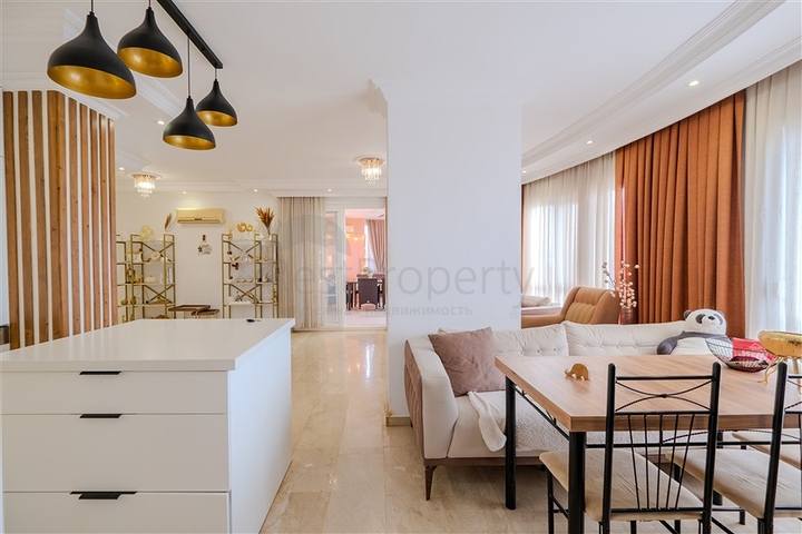 Квартира полностью меблирована и укомплектована бытовой техникой, что позволяет сразу заселиться без дополнительных затрат. Кухня оборудована современной техникой и рабочей поверхностью из гранита. В гостиной предусмотрена зона отдыха и обеденная зона. Спальные комнаты оснащены мебелью и системами хранения. Напольное покрытие — плитка и ламинат, в санузлах установлены душевые кабины. Для поддержания комфортной температуры установлены кондиционеры.