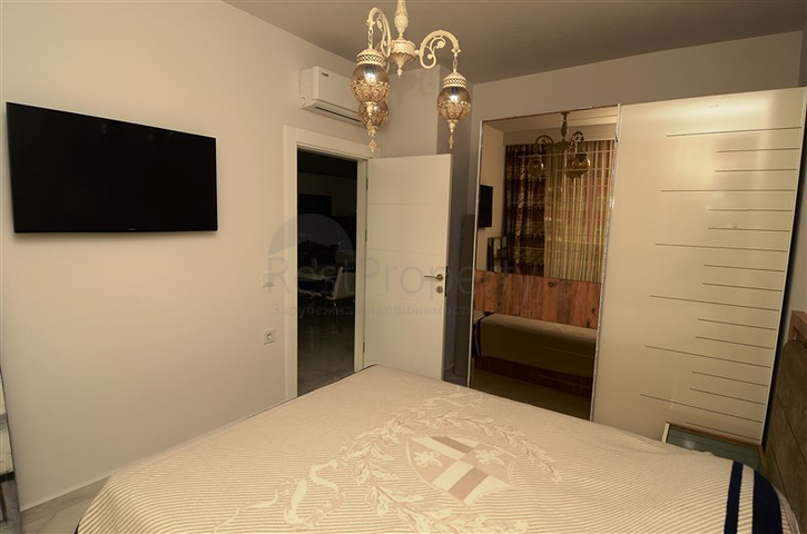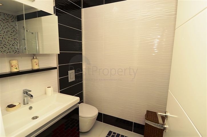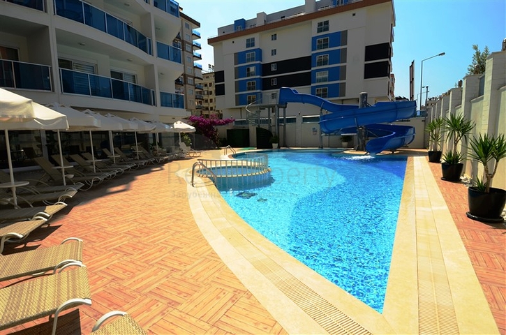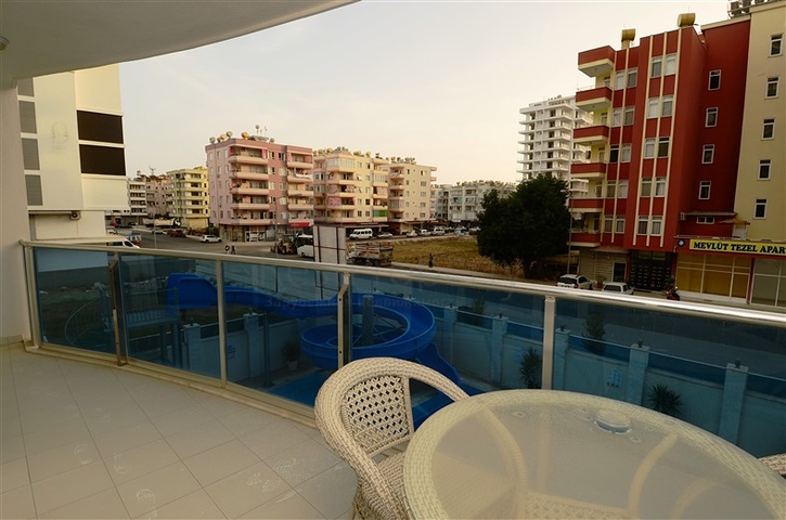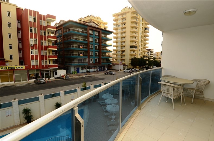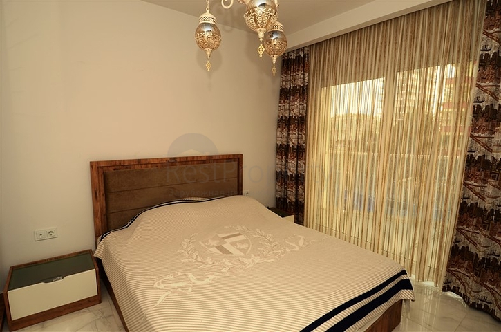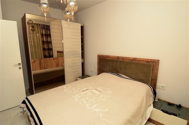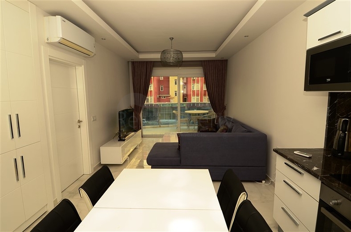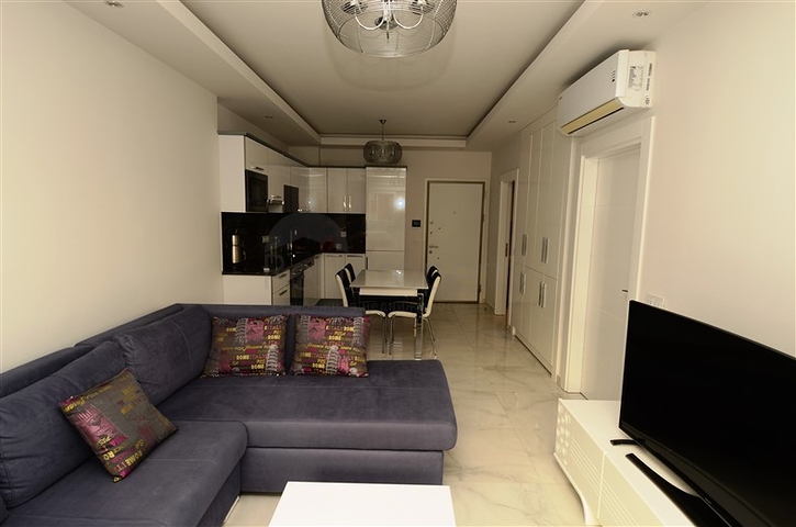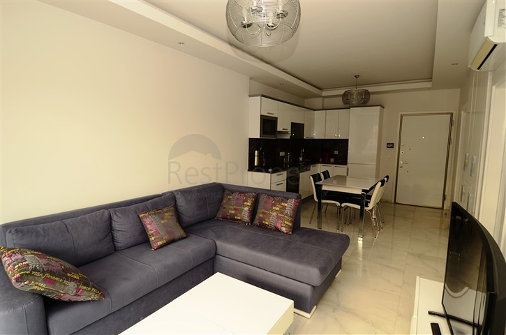 В элитном комплексе в Махмутларе выставлены на продажу двухкомнатные апартаменты. Квартира с одной спальней, гостиной и кухней американского плана имеет площадь 68 м2 и располагается на втором этаже. Апартаменты очень уютные и уже продаются полностью меблированными и оборудованными бытовой техникой.