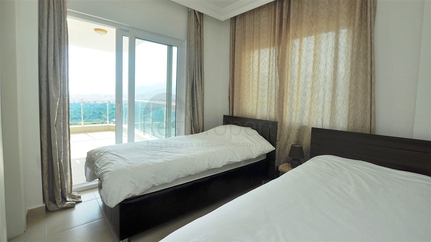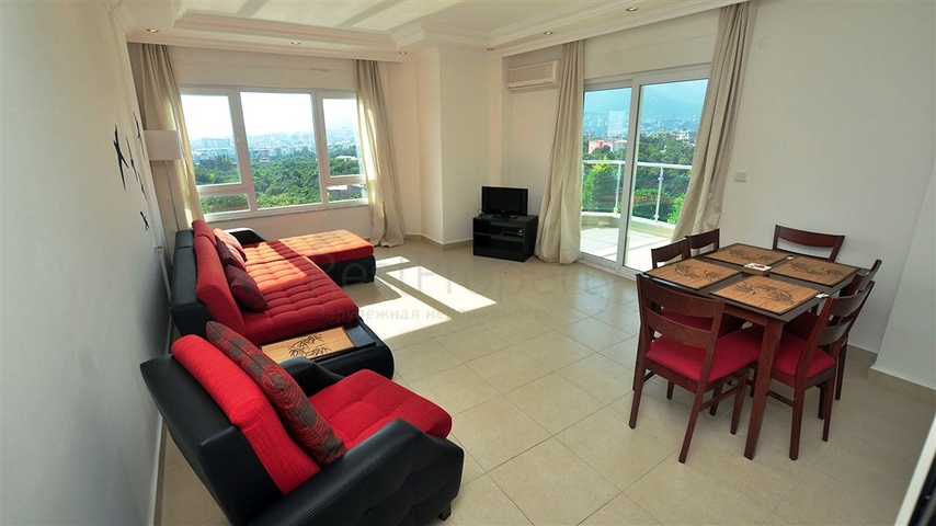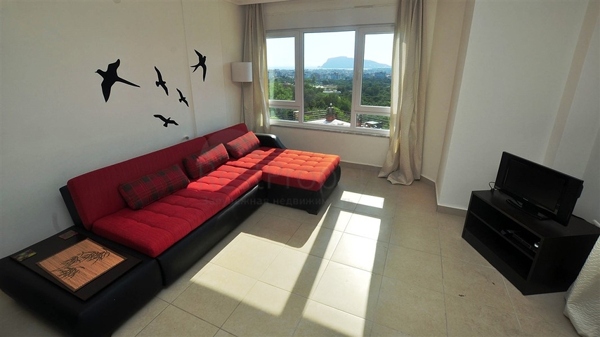 Светлые апартаменты планировкой 2+1 имеют гостиную в американском стиле, с панорамными окнами и прекрасным видом на горы, две спальные комнаты, два санузла и один балкон с зеленым пейзажем.