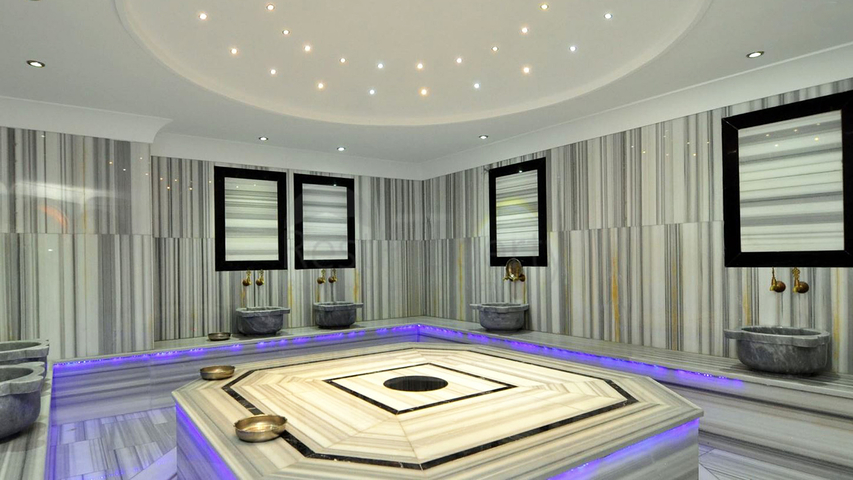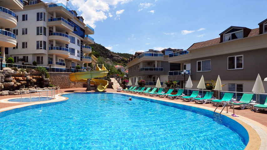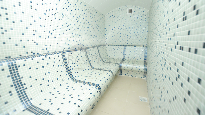 Комплекс состоит из красивых стильных блоков, оформленных в голубом и белом цвете. Красиво оформленный зеленый двор с прогулочными дорожками. Инфраструктура комплекса создает все условия для получения полного спектра услуг для достойных самого лучшего. Во всем комплексе проведен интернет. К вашим услугам большой открытый бассейн с аквапарком, а также бассейн для малышей. Для прохладной погоды имеется крытый бассейн, также с детской зоной в шикарной СПА зоне. Там находятся массажная комната, финская сауна, парная и конечно турецкий хамам. Современный тренажерный зал для занятий фитнесом. Стол для настольного тенниса и бильярд порадуют любителей этого вида спорта. Собственный кинотеатр. Уютная зона отдыха с барбекю и беседкой понравится любителям отдыхать на свежем воздухе. Детская игровая площадка во дворе будет в радость вашим малышам, а отлично обставленная игровая комната придется им по вкусу. Открытая парковка для вашего автомобиля, а также привратник на входе.