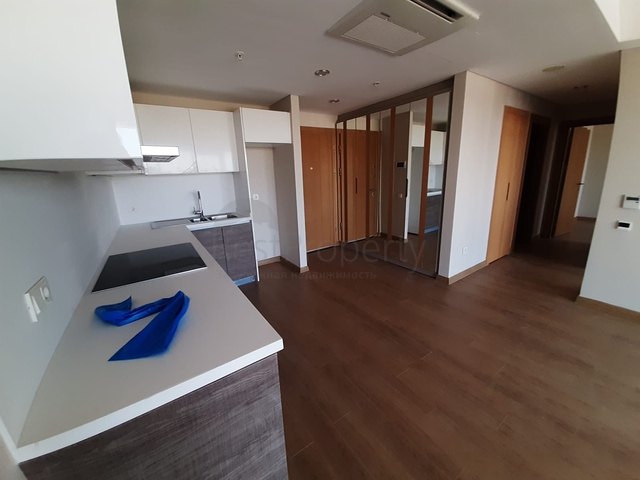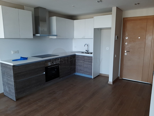Квартира представляет собой трехкомнатную планировку (2+1) с двумя спальнями, кухня открытого плана, гостиная зона, две ванных. В стоимость квартиры входит чистовая отделка с бытовой техникой (варочная панель, встроенная кухонная мебель, ванная мебель).