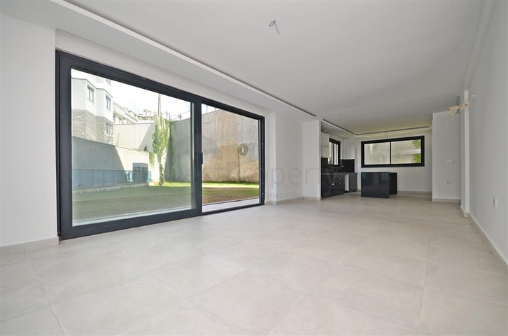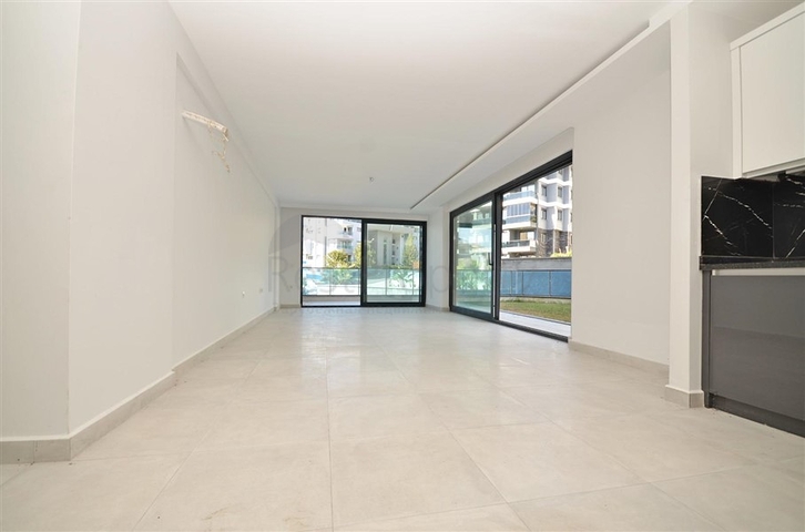 Планировка включает светлую гостиную, кухню с гранитной рабочей поверхностью, три спальни, два санузла с душевыми кабинами и два балкона. В квартире установлены кондиционеры, напольное покрытие выполнено из плитки. Формат жилья с выходом в сад создаёт дополнительное удобство и приятную атмосферу для жизни.