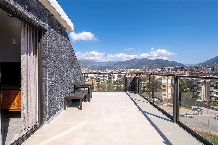 Квартира находится на верхних двух этажах и имеет планировку 4+1, которая включает в себя гостиную с кухонной зоной, четыре спальные комнаты, три санузла и два балкона. С последних открывается красивый вид на горы. В стоимость входит вся необходимая мебель и бытовая техника, и квартира полностью готова к заселению.