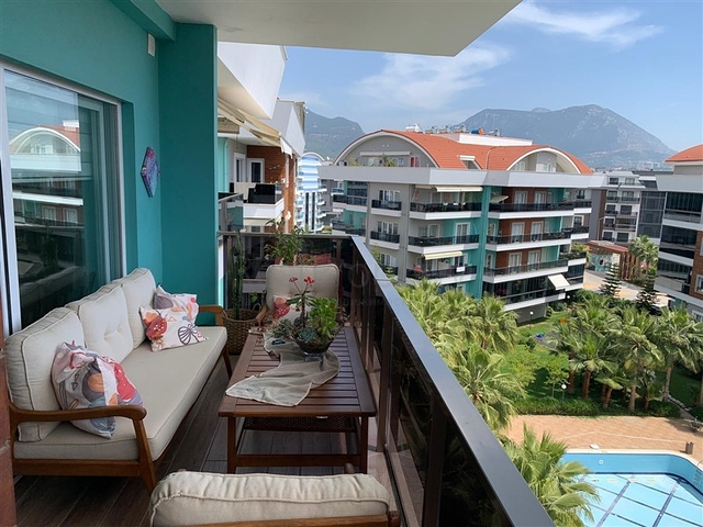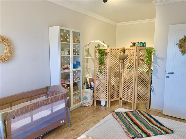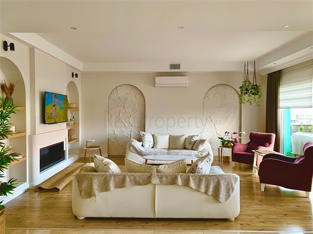 Квартира с удобной планировкой 4+1 и общей площадью 214 м² расположена на верхнем этаже малоэтажного жилого дома. Внутреннее пространство продумано для комфортного проживания большой семьи: светлая гостиная, отдельная кухня с гранитной рабочей поверхностью, четыре спальни, три ванные комнаты, три санузла, два балкона и терраса. Квартира продаётся с мебелью и бытовой техникой, напольное покрытие — ламинат, в ванных комнатах установлены душевые кабины, система кондиционирования обеспечивает комфорт в любое время года.