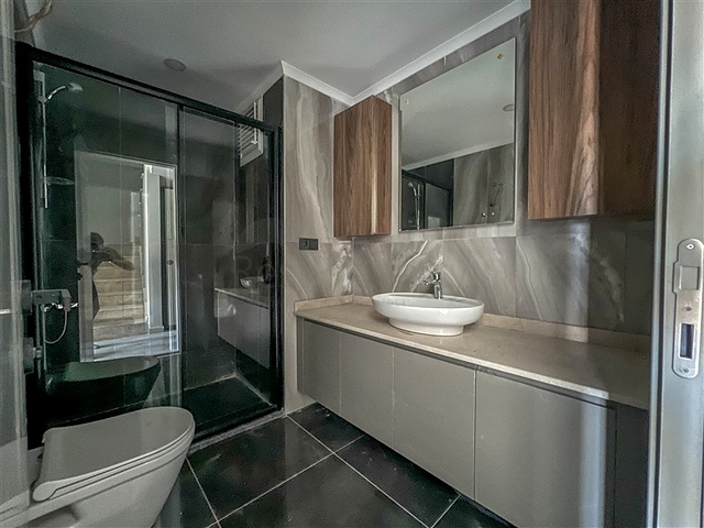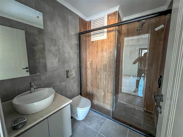 Предлагается квартира планировки 2+1, расположенная на 4 этаже современного жилого дома. Общая площадь 110 м², продуманная планировка с гостиной и кухонной зоной, двумя спальнями, тремя санузлами, двумя балконами и террасой. В отделке использованы качественные материалы, напольное покрытие — плитка, кухонная рабочая поверхность из гранита, установлены климатические системы. Квартира светлая, с большими окнами и аккуратными архитектурными решениями интерьера.