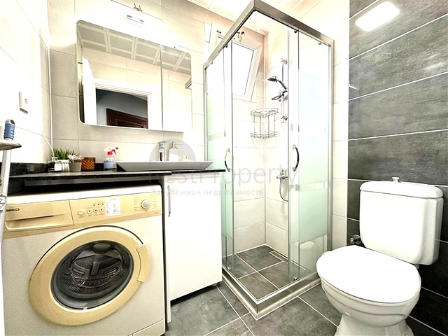 Квартира полностью меблирована и укомплектована бытовой техникой. Установлен кухонный гарнитур с гранитной рабочей поверхностью, напольное покрытие — практичная плитка, в санузлах оборудованы душевые кабины. Климат поддерживается с помощью кондиционеров. Окна обеспечивают хорошее естественное освещение, а продуманная планировка делает жильё удобным для проживания.