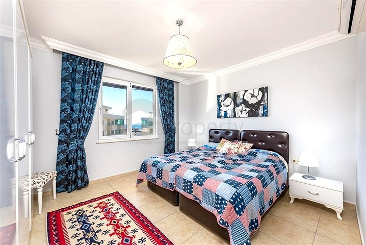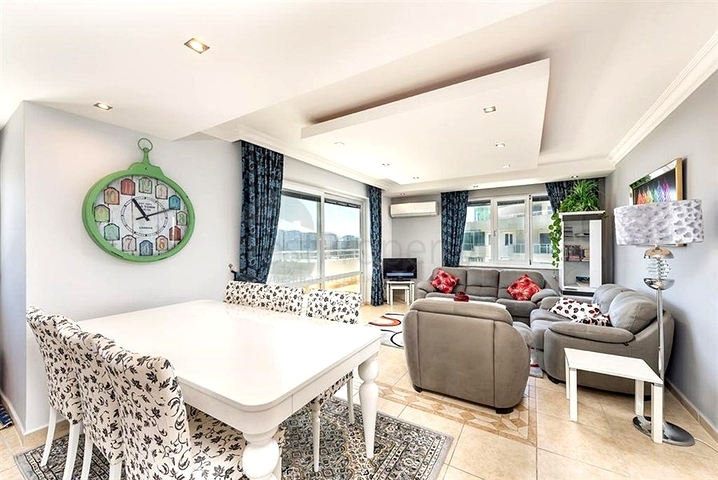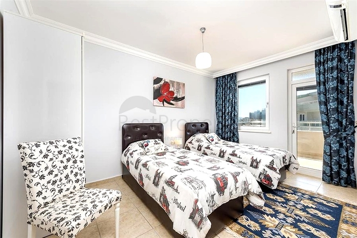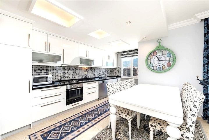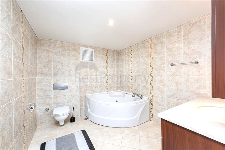 Предлагается просторная квартира 4+1 площадью 250 м² на 9 этаже жилого комплекса в районе Тосмур. Планировка продумана до мелочей: светлая гостиная с выходом на балкон, отдельная кухня с гранитной столешницей, четыре изолированные спальни, две ванные комнаты, два санузла, терраса и два балкона.