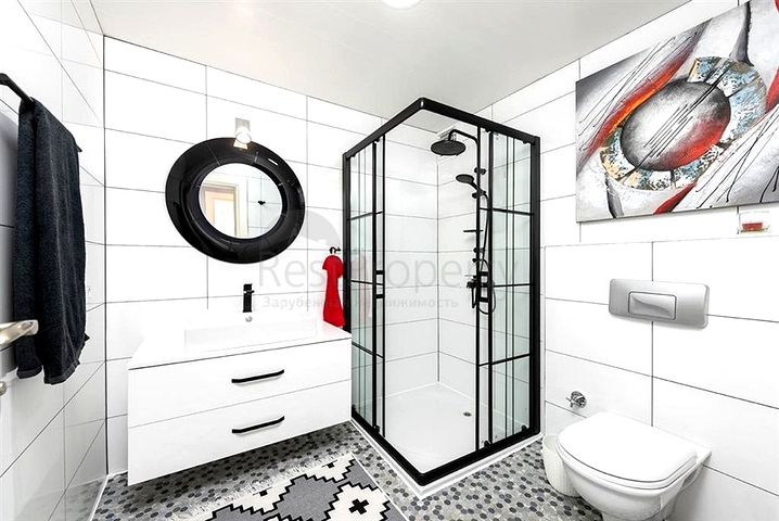 Квартира полностью меблирована и оснащена бытовой техникой, установлены кондиционеры, напольное покрытие — керамическая плитка, в санузлах — душевые кабины и качественная сантехника. Интерьер выполнен в светлых тонах, комнаты наполнены естественным светом, из окон открываются панорамные городские и горные виды.