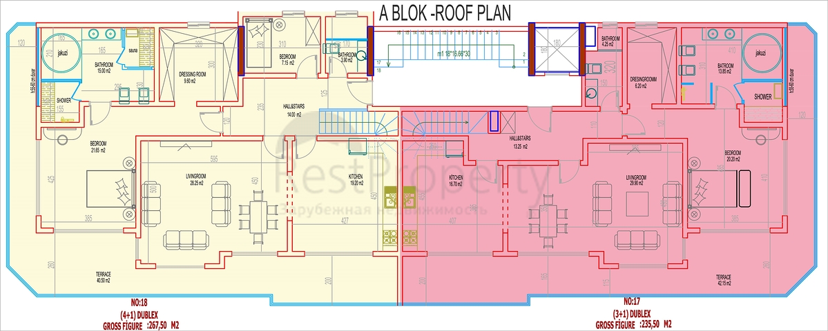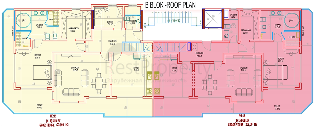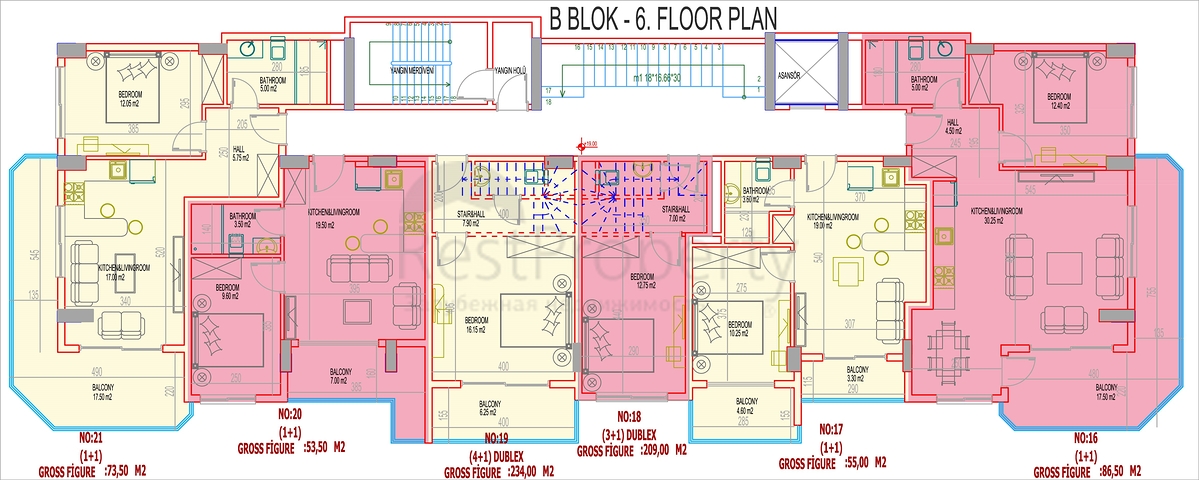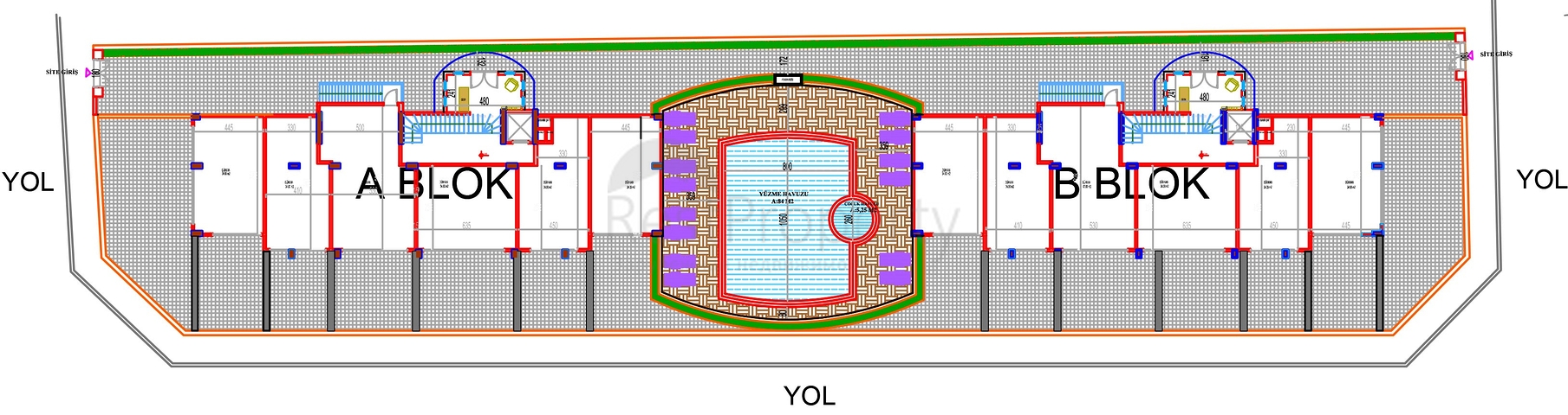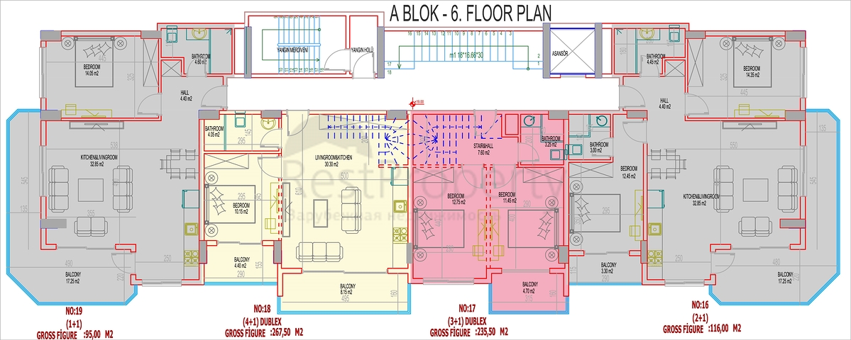 Данный комплекс состоит из 2 блоков. Каждое здание имеет 6 этажей. На продажу выставлены квартиры следующих планировок: 3+1 и 4+1. Часть квартир уже раскуплена, поэтому спешите не упустить возможность приобрести свое жилье на берегу моря.