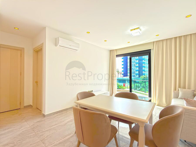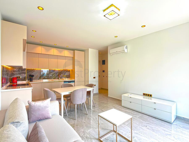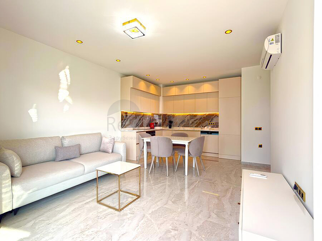 Предлагаются стильные апартаменты формата 1+1 на втором этаже современного жилого комплекса, расположенного всего в 200 метрах от моря. Просторная квартира площадью 54 м² состоит из гостиной, совмещённой с кухней, уютной спальни, ванной комнаты с душевой кабиной и балкона с видом на море. Квартира полностью меблирована и оснащена всей необходимой бытовой техникой, есть климат-контроль и система подогрева пола.