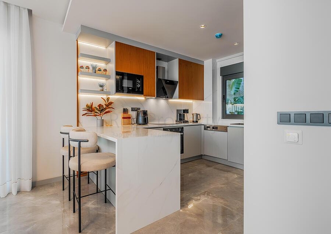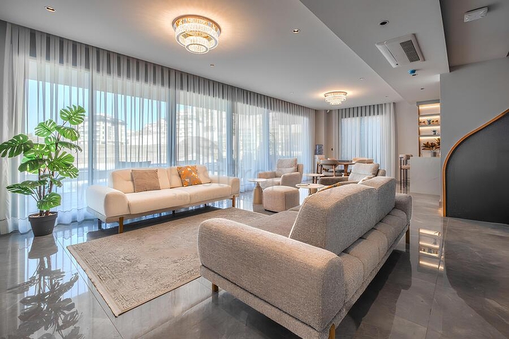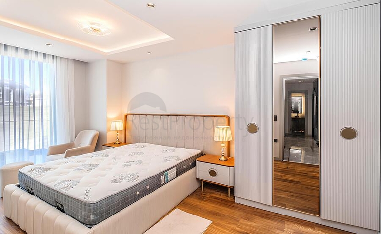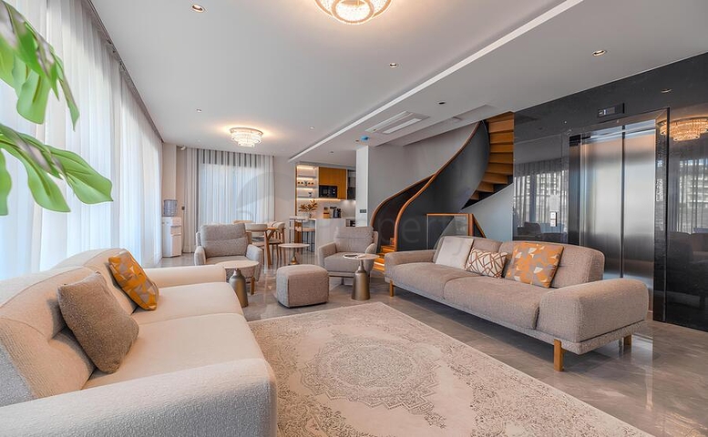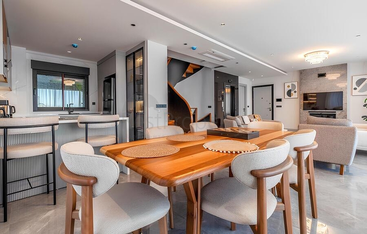 Вилла включает просторную гостиную, отдельную кухню с гранитной рабочей поверхностью, три спальни, две ванные комнаты с душевыми кабинами и три санузла. Дополнительным преимуществом является терраса и балкон, создающие удобные зоны для отдыха. Вилла полностью меблирована и оснащена бытовой техникой, установлены кондиционеры и система тёплого пола, напольное покрытие выполнено из качественной плитки, интерьер оформлен в светлых нейтральных тонах.