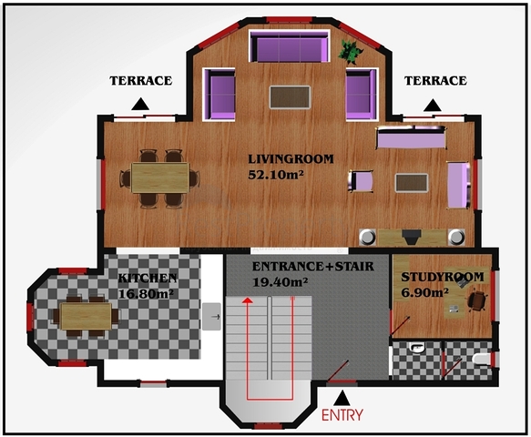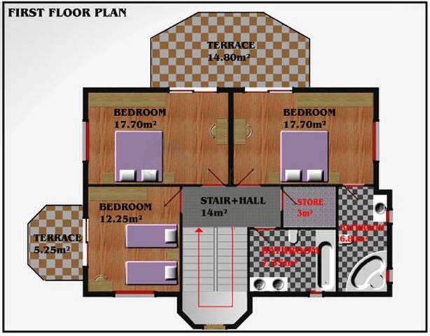 Планировка виллы подразумевает: 4 спальни, 3 ванных комнаты, гостиную, кухню, несколько террас.