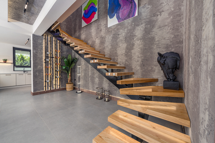 Площадь главного здания составляет 200 м², в нём установлены полы с подогревом. В отдельно стоящей пристройке площадью 160 м² расположены две спальни, гостиная и кухня.