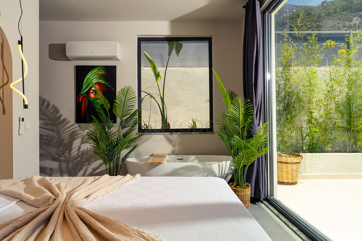 Эта вилла, построенная на участке площадью 645 м² в Оваджике, Олюдениз, Фетхие, может похвастаться совершенно новым, стильным, роскошным дизайном интерьера и великолепной архитектурой. Вилла состоит из двух секций.
