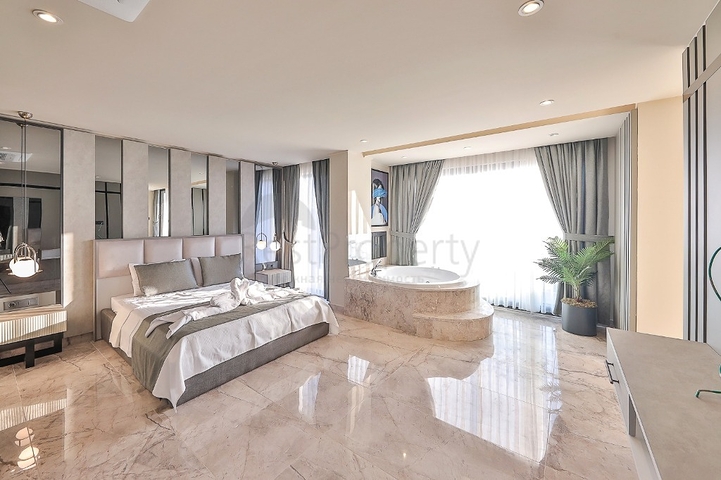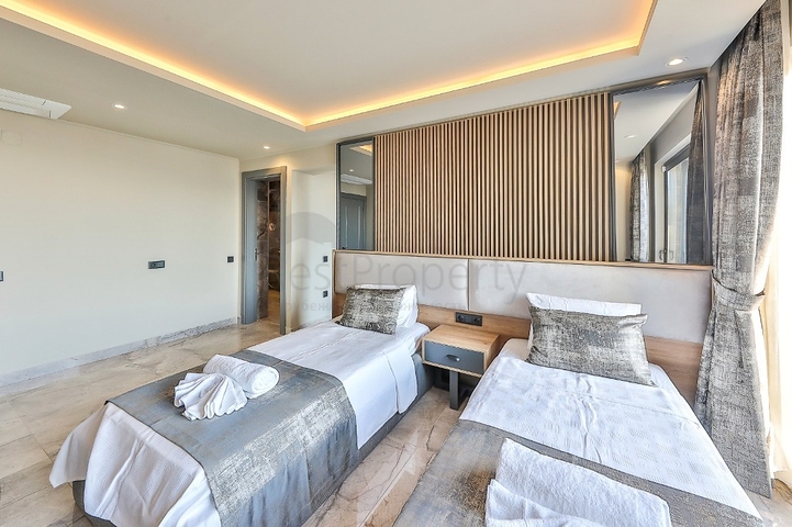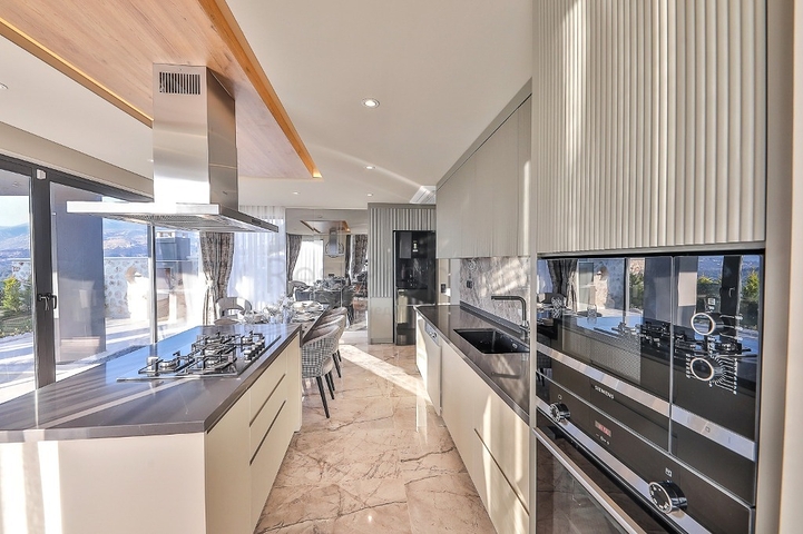 Интерьер выполнен в современном стиле: светлые тона, качественные материалы отделки, продуманное освещение и современная кухня, полностью оборудованная встроенной бытовой техникой. В главных спальнях предусмотрены джакузи, из окон открываются панорамные виды на море и зелёные холмы.