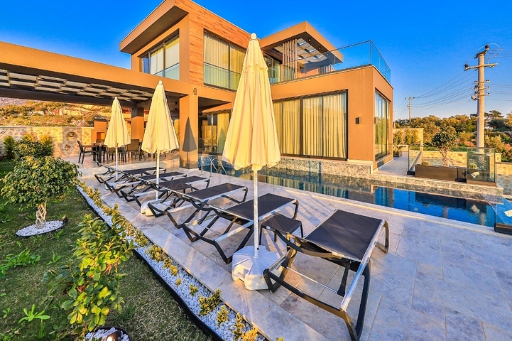 Великолепная современная вилла расположена в одном из самых живописных районов Калкана и предлагает всё для комфортной жизни и отдыха круглый год. На участке площадью 442 м² расположен дом общей площадью 409 м², включающий пять спален и пять ванных комнат. Просторная гостиная с панорамными окнами выходит прямо к открытому бассейну и солнечной террасе с шезлонгами.